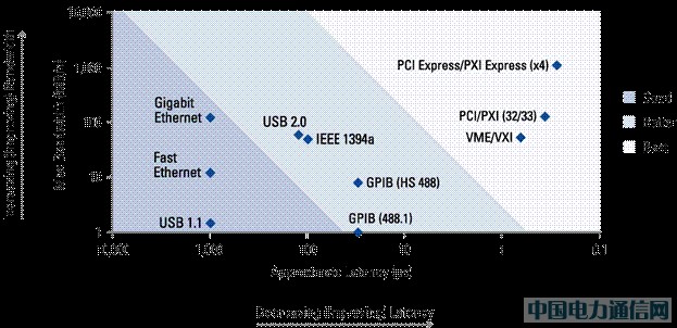 图3. 各种仪器控制总线的带宽与延迟对比图