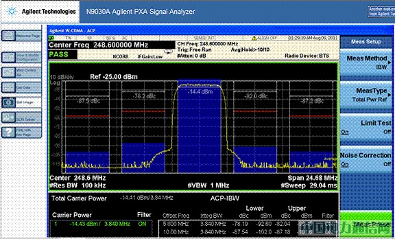在WCDMA ACLR测试中,Agilent PXA和NI PXIe-5665读取相邻频道中约-81 dBc的信号。对于两种设备均按如下方式设置: