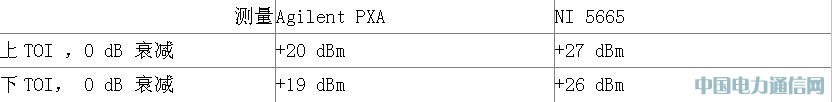 图7. NI PXIe-5665和Agilent PXA的三阶信号成分。NI PXIe-5665的三阶信号成分的绝对强度接近-95 dBm。