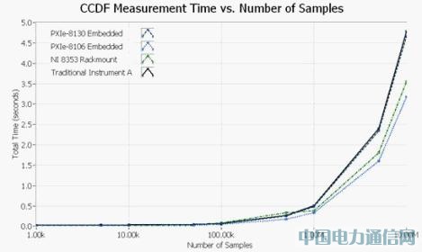 对于多数的WCDMA物理层测量来说,测量值的处理时间对整体的测量时间影响最大。对于这些测量来说,整体的测量时间通常与进行平均的次数有关。但也有一个例外,就是需要特别大的数据采集量的CCDF测量。在这种情况下,处理器的性能对于整体的测量时间影响较小。图6所示即为CCDF测量,可以看到PXI测量系统比传统仪器略快一些。