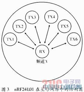 nRF24L01在接收模式下可以接收6路不同通道的数据,如图3所示。每个数据通道使用不同的地址,但共用相同的频道。即6个不同的nRF 24L01设置为发送模式后,可以与同一个设置为接收模式的nRF24L01进行通讯,而设置为接收模式的nRF24L01可以对这6个发射端进行识别。n RF24L01在确认收到数据后记录地址,并以此地址为目标地址发送应答信号。在发送端,数据通道0被用作接收应答信号。