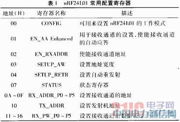 通过对CONFID配置设定其工作模式,设置接收地址,接收有效数据宽度、选择射频通道、数据传输率、发射功率等参数。配置完成后,置高CE,准备接收数据包,如表1所示。
