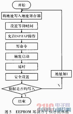 STC12L5608AD单片机内部有8个扇区,每个扇区512 Byte。在使用时,统一修改的数据放在同一个扇区。使用ISP/IAP功能,所使用的特殊功能寄存器为ISP_DATA、ISP_ADDRH、ISP_ADDRL、ISP_CMD、ISP_TRIG、ISP_CONTR。扇区写入数据流程图如图5所示,扇区擦除以及读操作流程与之类似。