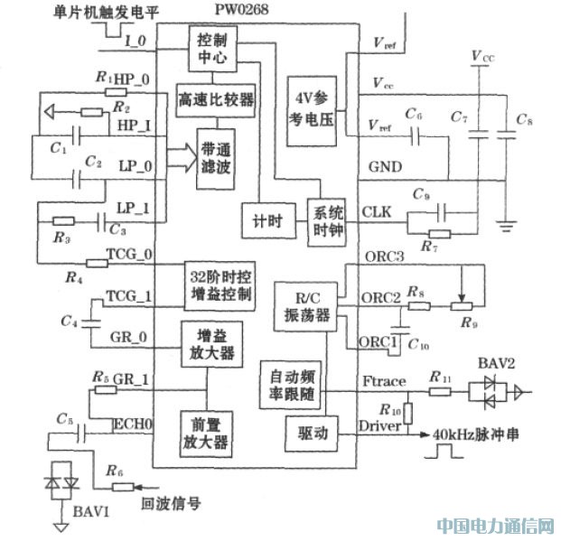 C8051f320 检测到这个下降沿即认为收到回波信号,从而计算出距离值。PW0268 内部原理及外围电路如图3 所示。