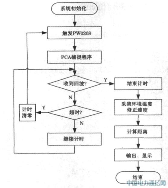 系统工作在连续实时测距状态下,在初始化后,低电平触发PW0268 发出超声波驱动信号,同时开启PCA 捕捉计时,系统开始等待接收回波信号,当在最大等待时间内接收到回波信号则停止计时,根据环境温度修正声速后,计算出距离值并输出显示,一次完整的测距过程完成; 当在最大等待时间内收不到回波信号,则计时清零重新触发。系统运行的流程图如图5 所示。