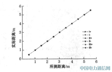 为标定超声波测距系统测量精度,使用100 cm × 100 cm ×2 cm 硬平木板作障碍物进行测量,并用钢卷尺测量实际距离作为标准值。经过试验验证,所设计的超声波测距系统测量盲区约为300 mm,在( 500 ~ 5 500) mm 范围内对系统进行了3 次正反行程的标定试验,并对实验数据进行了分析和计算,测试数据如表1 所示,拟合直线如图6 所示。由此计算出超声波测距系统静态特性指标,即线性度为: 0. 11%,重复性为: 0. 15%,迟滞为0. 10%.