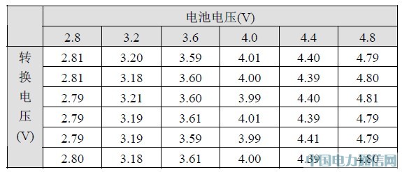 为了验证上述方法,设计了一个实验系统,图3中的运算放大器采用OP07,而模数转换采用16位高精度A/D芯片AD7705.随机抽取电池进行测量,测量电压从2.7V~4.2V,每隔0.4V取一个测量点,每隔测量点测6个数据,如表1所示。
