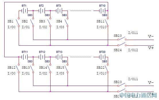 在没有分时复用时,需要占用21个I/O口。现在把电池组分成两半,设计出新的开关阵,如图5.第一部分为1~10号电池,第二部分为11~20号电池。给每个电池端设置一个开关(SB1~SB11,SB12~SB22),分别对单个电池进行选通,同时给每一组电池设置总开关(SB23~SB24,SB25~SB26),来选通第一或第二组电池。开关SB1~SB11和SB12~SB22就可以对应占用相同的微处理器I/O口,即I/O0~I/O10,从而总占用I/O就由21个减少到15个(包括4个总开关I/O)。当测量1号电池时,I/O0和I/O1为低电平,SB1、SB2、SB12、SB13闭合,同时闭合SB23、SB24,断开SB25、SB26,则1号电池端电压进入测量总线V+、V-,经过差分放大、模数转换后便可算出端电压,而SB12、SB13虽然闭合,却没有任何影响。同理,当测量11号电池电压时,闭合SB1、SB2、SB12、SB13,同时闭合SB25、SB26,断开SB23、SB24.测量其他电池时也进行类似处理。