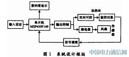 系统以MSP430F149单片机为控制核心,温度测量由铂电阻恒流调理电路完成,调理电路的输出电压送入单片机,在单片机内部实现A/D转换,并对采样数据进行滤波及标度变换处理,温度值由3位数码管显示。输入的温度设定值由4位独立式键盘电路进行,设定值送入单片机后,由另一个3位数码管显示。系统设计框图如图1所示。