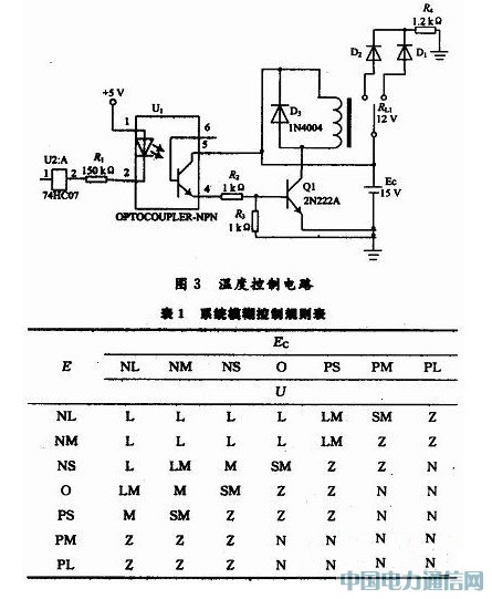 采用温度误差E和温度误差变化率Ec作为模糊控制器的输入变量,温度控制量U作为模糊控制器的输出变量。系统中温度误差E、温度误差变化率Ec和温度控制量U(单位:℃)的基本域分别为[-5,+5],[-2,+2]和[0,1]。输入语言变量的语言值取7个,输出控制量用于控制继电器驱动电路。将占空比模糊控制量设定为0,1/4,1/2,3/4,1五个单点模糊量和1个控制风扇吹风的单点模糊量。输出语言变量的语言值取6个。当U=0时,单片机P3.5口置低电平,使风扇控制电路工作;当U=1时,加热丝控制电路工作,且继电器在1个周期内全关断;当U=2时,加热丝控制电路工作,且继电器在1/4个周期内接通,在3/4个周期内关断;当U=5时,加热丝控制电路工作,且继电器在1个周期内全接通。本控制系统选用三角函数、升半梯形函数与降半梯形函数作为输入量语言值的隶属函数,用脉冲函数作为输出量语言值的隶属函数。模糊控制规则如表1所示。
