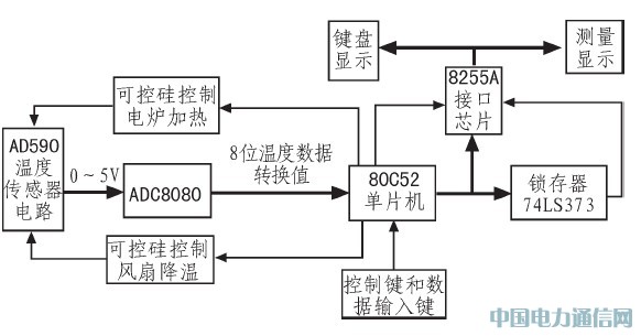 系统采用温度传感器对炉膛内的实时温度进行检测、转换、采样,所得的检测信号经A/D转换器转换成数字信号进入单片机,并与单片机内预先设定的温度给定值加于比较得出偏差,偏差送入控制器,单片机执行偏差的PID数字运算得到可控硅的触发脉冲,并由这个触发脉冲调节可控硅的导通时间,从而调节电炉丝与风扇的两端电压形成控制作用,使炉温保持恒定。