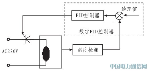 τ为纯滞后时间,K为放大倍数,T为惯性时间。在滞后时间和惯性时间均不太大、控制对象非线性小,参数时变性小的场合,RID控制是一种最直接最有效的控制方法。本文采用数字PID控制技术,设计了一个实验室可用、中小型的、温度在环境温度至此320℃范围内可调的电加热炉温度控制系统,系统结构如图1所示。