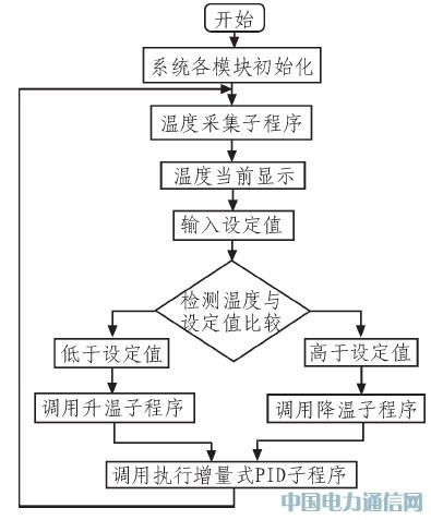 程序流程如图3所示。系统程序包括主程序、对80C52单片机硬件电路的初始化、显示程序、键盘处理程序等。控制器的软件主要包括两部分:监控程序和控制程序。监控程序的主要功能包括初始化设置、内存清零、定时采样、键位操作和显示等。控制程序的主要功能包括定时、数据处理、温度控制子程序等。该系统的软件是在80C52单片机仿真开发环境下采甩基于51系列的C语言编写的,用C语言来设计程序大大提高了开发调试的工作效率。