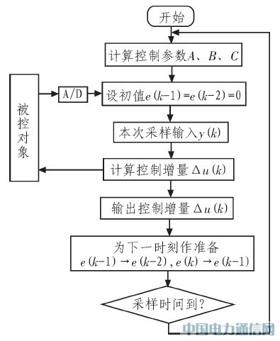 在计算机系统中,一般采用恒定的采样周期T,当确定了Kp、Ki、Kd时,根据前后3次测量的偏差值就可以求出控制增量△u(kT)。增量式PID程序流程图如图4所示。