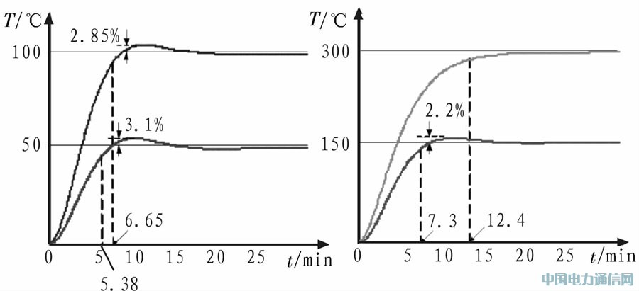 该系统炉温在一定范围内根据实际控制对象可以人工设定,图5为电加热炉温度设定值在50、100、150和300℃时的升温曲线图。从图中可以看出,炉温获得了良好的控制,各项指都达了电加热炉加热对象要求起跳快、调量小、控制平稳的技术指标。