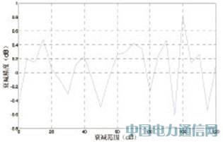 图7展示了可编程衰减器单通道在衰减范围内的衰减精度。从图中可以看到,在0~80dB的衰减范围内衰减精度可以达到0.5dB;在80dB~120dB衰减范围内衰减精度达到1dB。