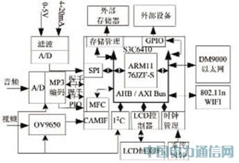 数据采集是指将温度、压力、电压、电流、位移、流量等模拟量采集转换成数字量后,再由计算机进行存储、处理、显示或打印的过程,相应的系统称为数据采集系统。随着计算机技术的迅猛发展,人们对工业安全生产和现代化管理要求越来越高,数据采集仪不但需要采集现场各种传感器信号,有时还需要进行音频和视频的采集和传输,以便监控人员可以更好的掌握现场信息。当今,虽然许多高速度、高分辨率、大存储量的高性能数据采集仪不断涌现,现有的数据采集仪仍存在CPU频率低、处理能力有限的问题。由于音频和视频信号的数据量巨大,单台便携式数据采集仪很难完成各种传感器信号与音视频信号实时的采集及传输,许多数据采集中都会采用多台设备把音频、视频和其它工业现场传感器信号分开采集传输的方式,这种数据采集方法具有安装维护成本高、占用空间大等缺点。