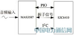 嵌入式产品一大特点是CPU资源有限,为了减轻CPU在数据处理中的负担及减少数据传输所需的带宽,本设计对采集到的音频和视频数据分别进行了硬件压缩编码。音频采集处理中采用Micronas半导体设计及制造公司生产的MAS3587芯片。该芯片集成了前放以及A/D转换模块,支持模拟和数字串并行两种方式输入输出,具有MPEG1/2 layer3格式编码和MPEG1/2 layer2 and layer3格式解码功能。芯片内部包含耳机驱动模块,模拟输出信号可以不经过放大直接驱动耳机。音频采集电路如图4所示,MAS3587接收到模拟信号输入后,先通过芯片的A/D部分将模拟信号转换为数字信号,然后将A/D转换后输出的数字信号送入芯片内置的MP3压缩编码模块完成MP3格式的编码。图4中,S3C6410通过I2C总线对MAS3587芯片进行初始化,通过握手信号线与并行数据线读出经过MP3格式编码后的音频数据,并把数据进行存储及传输。
