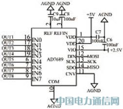 在数据采集中经常需要把模拟信号转换成处理器可以识别的数字信号,以便采集仪可以对信号进行处理和传输,这就要用到A/D转换电路。A/D转换器从变换原理来看,主要有并行比较型、逐次逼近型和双积分型等。并行比较型转换速度快,可达数十纳秒,但是价格昂贵,非必要时一般不会采用;双积分型A/D转换器的转换时间较长一般要达到40ms~50ms;逐次逼近型具有较高转换速度,可达几微秒,价格适中。本设计采用ADI公司生产的AD7689芯片来对滤波后的电压信号进行A/D转换。AD7689是一款采用单电源供电的8通道、16位分辨率、无失码、电荷再分配逐次逼近型模数转换器(ADC)。AD7689使用简单的SPI接口实现配置寄存器的写入和转换结果的输出。