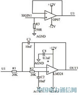滤波,本质上是从被噪声畸变和污染了的信号中提取原始信号所携带的信息的过程。采集仪滤波电路如图2所示,因为滤波及AD转换信号为电压信号,所以在电流输入端加入了一个250Ω的精密电阻和一个电压跟随器,电流信号首先通过精密电阻转换为1V-5V电压信号,再经过电压跟随器进行阻抗匹配后进入滤波电路滤去高频干扰。对于电压输入则直接进入滤波电路进行滤波。在滤波电路中,因为巴特沃斯响应能够最大化滤波器的通带平坦度,特别适用于低频应用,其对于维护增益的平坦性来说非常重要,所以本设计采用巴特沃斯二阶低通滤波器。电压信号经过由运放LM324构成的二阶巴特沃斯滤波器进行低通滤波,滤波完成后,信号进入A/D转换模块进行A/D转换。根据巴特沃斯二阶滤波器特性可知滤波器的截止频率为: