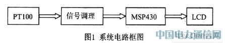 根据测试系统所要求的测量范围,选用的传感器为铂电阻PT100,Pt100的测量范围是-200到850,从PT100的分度表可以计算出线性度为,无法达到测量精度的要求,所以需要一个线性补偿的信号调理电路,线性补偿电路通过采用XTR105芯片,通过温度测量范围匹配电阻,从而达到设计要求。AD转换用MSP430F149单片机内部12位分辨率的ADC。LCD是2行×16列的字符型液晶显示器。系统的电路框图如图1所示。