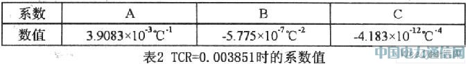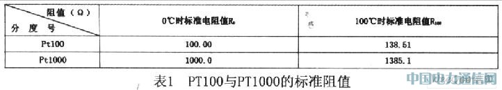 按IEC751国际标准,温度系数TCR=O.003851,Pt100(R0=100Ω)、Pt1000(R0=1000Ω)为统一设计型铂电阻。TCR=(R100一R0)/(R0×100)。PT100与PT1000的标准阻值如表1所示。
