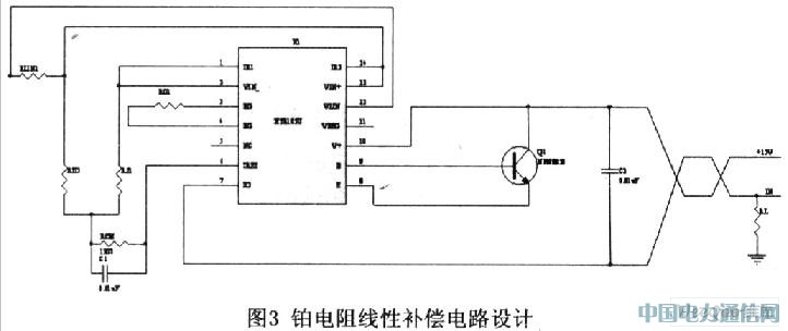 由于铂电阻的温度电阻特性具有线性度不好,在进行线性补偿时选用XTR105,铂电阻线性补偿电路如图3所示。各个电阻的计算公式如下。