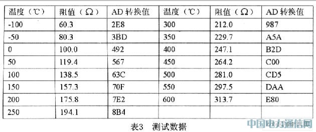 完成硬件与软件的设计后,进行系统联试。首先测试ADC的功能模块,测试的方法采用高精度的可变电阻器替代铂电阻PT100的阻值,根据铂电阻PT100分度表调节对应温度的可变电阻的阻值,从-100℃到600℃区间取15个点,每50℃测试一次,记录AD转换值。温度和转换值进行最小二乘法线性拟合,计算出线性度等测量系统的指标。线性度计算结果为小于1%,测量数据如下: