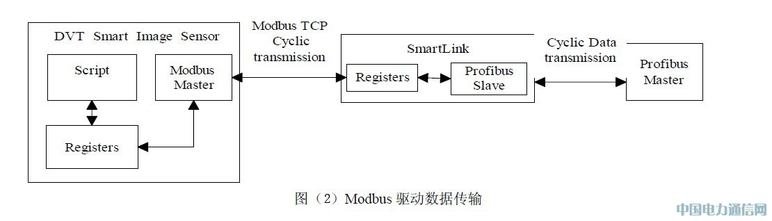 智能图像传感器上运行的script将数据写入传感器存储器的寄存器中。Script软传感器与检测是同步的,背景script与检测是异步的。通过modbus协议,智能图像传感器中的数据可以传送到smartlink中。这是一个循环过程,图像传感器想主机一样读写smartlink。最后,smartlink中的数据与profibus网络进行循环交换。其数据传输过程如图(2)。