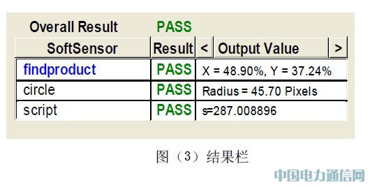 Script程序中的第一个命令就是写小孔半径到智能图像传感器的第100号寄存器。第二个命令就是读取第200号寄存器的数据,将该数据乘以2×3.14赋给script传感器输出小孔周长。然后这个值就可以在result table显示出来。见图(3)所示。