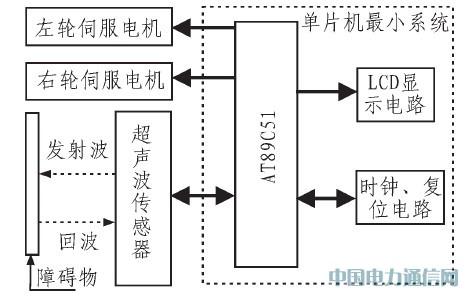 其中系统MCU采用目前性价比较高的AT89C51单片机,利用"位差超声波传感器"作为距离传感器,以非接触的形式测量前方物体的距离;显示设备采用LCD1602液晶显示模块;执行机构采用PARALLAX公司生产的连续旋转伺服电机,其优点是编程控制方便且不需额外增加驱动电路,图1中超声波传感器测距的工作原理如图2所示。