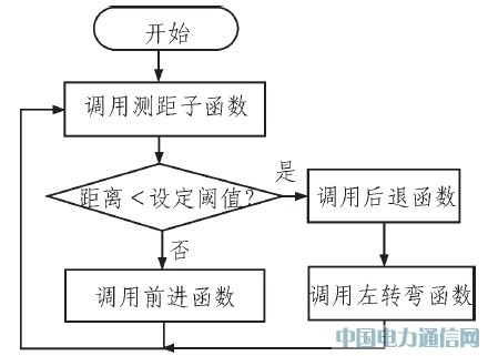 程序通过反复调用超声波测距子程序,获取智能玩具机器人前方被测物体的距离值;判断距离是否在设定阈值以内,若大于程序设定的距离阈值,调用函数Forward(),驱动智能玩具机器人前进;若小于程序设定的距离阈值,调用Backward(),驱动智能玩具机器人后退一段距离;接着又调用Left_Turn(),驱动智能玩具机器人左拐后程序再返回重复以上过程。