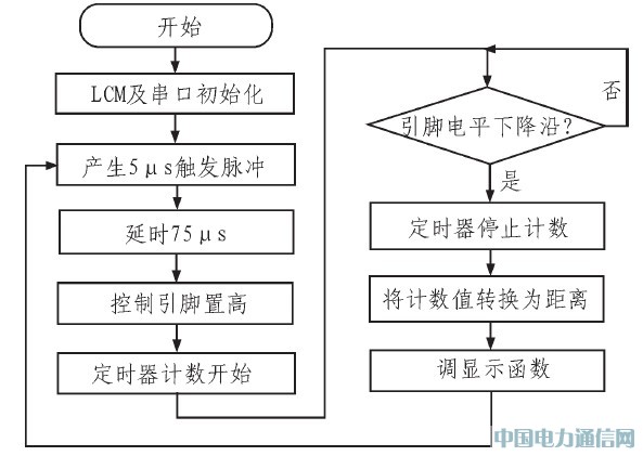 根据位差超声波传感器的时序原理图,对C51单片机内部定时/计数器编程,实现对前方物体距离的测量并将测量结果在LCD模块上显示。测距子程序的基本设计算法,用流程图表示如图4所示。