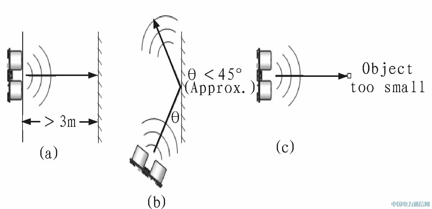 根据上述程序设计思路,在Keil C编译环境中用C语言编写程序代码,编译程序,将生成的HEX文件烧写到控制板上的单片机程序存储器,开机运行,智能玩具机器人按程序设定运行模式前进,当前方有物体时,在LCD显示屏上实时准确地显示出小车和前方物体之间的距离值;当小车距前方物体小于程序设定的距离阈值时,小车掉转方向继续前进,经反复实验表明:位差超声波距离传感器在下列情况下不能精确地测量距离,如图6所示。