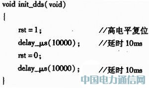 AD9851的复位时序如图4所示。从时序可以看出,AD9851芯片复位的条件是在RESET引脚出现一个高电平,并持续时间至少为trs.根据手册提供的时间参数,可知道trs最短时间是5个系统时钟,没有时间上限。由于系统电路中,单片机的晶振采用12 MHz.执行一条指令所需要的时间是1μs,为了保证复位时序的可靠性,采用复位的时间为10ms.