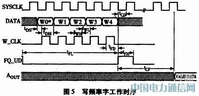 写频率字的工作时序是AD9851芯片的关键时序,它关系着信号发生器功能的实现。并行模式下,写频率字的工作时序如图5所示。