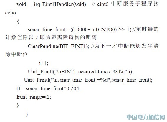 超声波的回波的检测是个难点,因为在ARM中一个端口设置中断只能设置一种触发方式,如果设为上升沿触发可以打开定时器定时但无法捕获下降沿,也就无法关闭定时器,从而不能测距,因此用软件的方式实现。首先设置两个时间延迟函数usdelay()和msdelay(),这样可以在给出高脉冲10us 后等超声波触发再打开定时期计时,在设置一个外部中断eint1 接到超声波传感器的echo 口并设置为下降沿触发,等下降沿来临关闭定时器读出值既为脉宽的时间长度,然后根据障碍物的距离=(ECHO高电平的时间)* 声纳速度/2 得出距离。空气中v 与温度关系:v=331.5√1+T/273 m/s,T 为摄氏温度。一般情况下超声波速近似声速,在室内温度影响下取约343.2m/s.