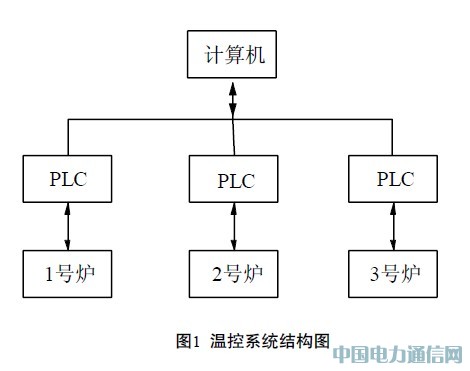 在锅炉温度控制系统中,电加热锅炉是过程控制工业中常用的设备,其温度控制也是过程控制的一个重点。PLC温度控制系统的结构如图1所示,PLC 通过加热棒及风扇分别控制炉子的加热及降温。计算机则实现目标温度的设定、动态显示、参数的设定等功能,从而实现实时温度监控。