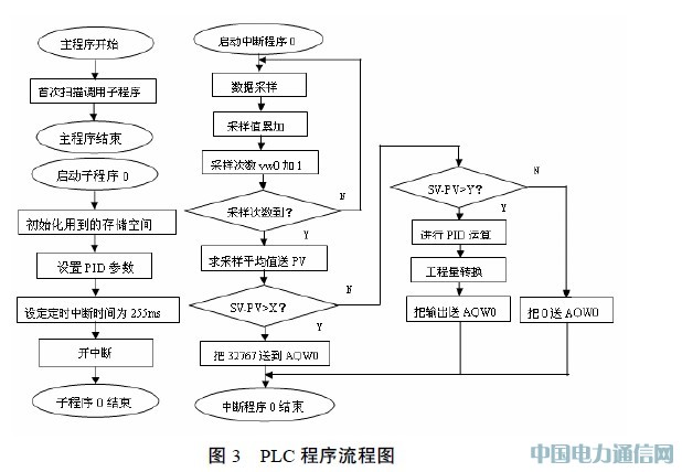 由于电加热炉具有较大的延时性,所以采输出值,0.0~1.012 Kc数正数双字,实数I 回路增益,正、负常数16 Ts I 采样时间,单位为s,正20 Ti I 积分时间常数,单位为min,24 Td I 微分时间常数,单位为min,正数式控制。大致采用三段控制: 第一段,开始阶段置电源为满开度,以最大的功率输出克服热惯性; 第二段,等到温度达到一定值转为PID控制; 第三段,接近设定点时置电源开度为0,提供一个保温阶段,以适应温度的滞后温升。程序流程图如图3 所示,图中X,Y根据实际设定。