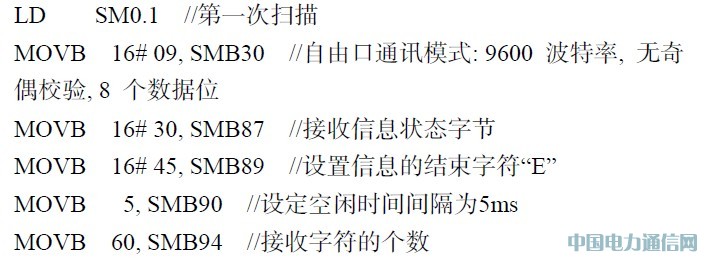 PLC 的CPU 处于STOP 模式时,自由口通讯被禁止,只有当CPU 处于RUN 模式时,才可使用自由口通讯。SMB30(这里选择端口0)是自由口模式控制字节,用来设定校验方式、通讯协议、波特率等通讯参数。发送指令XMT 启动自由端口模式下数据缓冲区中的数据发送,它可以方便地发送1~255 个字符,如果有中断程序连接到发送结束事件上,在发送完成后,端口0 会产生中断事件9,也可以监视发送完成状态位SM45 的变化。接收指令RCV 可以初始化接收信息服务,通过指定的通讯端口接收信息并存储在数据缓冲区内。在接收完最后一个字符时,端口0 产生中断事件23. PLC 初始化程序如下: