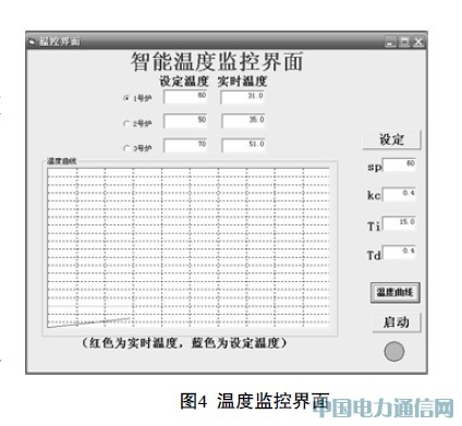 MSComm1.PortOpen= True//打开通信端口。计算机端的VB程序利用MSComm 控件与S7-200交换数据,通过自由口通讯程序从现场采集温度信号。并且上位机程序可以设定初始温度和PID参数、显示动态温度曲线。程序运行界面如图4所示。