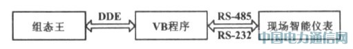 由图2可以看出,该系统的通信包括两部分:组态王与VB程序的DDE通信; VB 程序通过RS2232 /485 与现场智能仪表的通信。