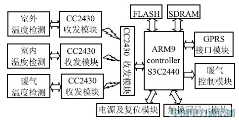 本系统硬件框图如图1 所示,主要由ARM9 控制器,温度检测模块,触摸屏显示模块,ZigBee 无线收发模块,暖气控制模块,GPRS 模块等组成。