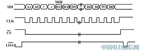 DAC7714完成一次数模转换,需要在CS为低电平期间,在CLK的上升沿,串行输出16位数据到SDI.16位数据中,前两位A1和A0的组合将决定对某一通道进行转换输出(00-A通道、01-B通道、10-C通道、11-D通道),接下来两位为无效位,最后的12位数据即真正需要转换的数据。其工作时序图如图2所示。