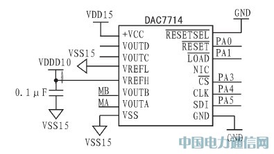 DAC7714是美国TI公司推出的一款4通道12位串行输入、电压输出型DA转换器。其供电电压为±15 V,可以实现输出自动保持,采用此串口芯片除了具有节省单片机资源的优点外,还具有同时输出多路0~10 V(参考电压为+10 V和0 V),特别适用于MCU资源紧缺而控制通道比较多的场合。