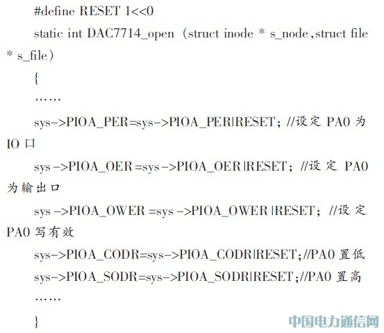 应用程序中使用open函数打开DAC7714设备时,实际调用以下函数完成对控制器相应引脚的初始化操作(以PA0连接RESET为例介绍):