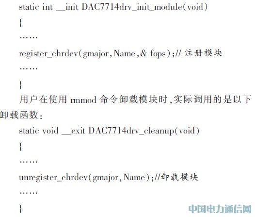 DAC7714驱动程序作为设备文件,同样分为open、write、release等几个操作。对于内核来说,DAC7714属于字符型设备,并为该设备命名为Name[]="DAC7714drv".该模块在使用时采用insmod命令进行动态加载,使用rmmod命令进行动态卸载。DAC7714驱动程序主要由注册函数、注销函数、初始化函数、DA输出函数构成。