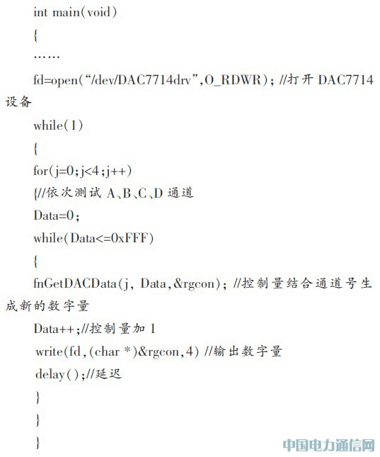 首先调用open函数打开DAC7714设备,然后控制数字量从0依次加1,并结合通道号生成DAC7714所能识别的控制数字量,然后调用write函数控制输出,当控制数字量达到最大值时,切换下一通道。测试程序主要代码如下。