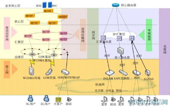 本地传输网以传送移动回传业务为主,各运营商根据自身情况不同主要采用SDH/MSTP、WDM/OTN、PTN等技术,提供基站至BSC/RNC之间的传输通道,覆盖范围广。IP城域网采用IP/MPLS技术,是互联网骨干网在城域部分的延伸,仅覆盖核心及部分汇聚节点,覆盖范围小。宽带接入网主要采用xPON和DSL方式,目前与移动基站之间独立组网,重复节点很少。光缆网络和管道是各种网络的基础网络资源,基站接入和固网接入的骨干路由及网络的核心汇聚层光缆、管道等基础资源均可以实现共享。