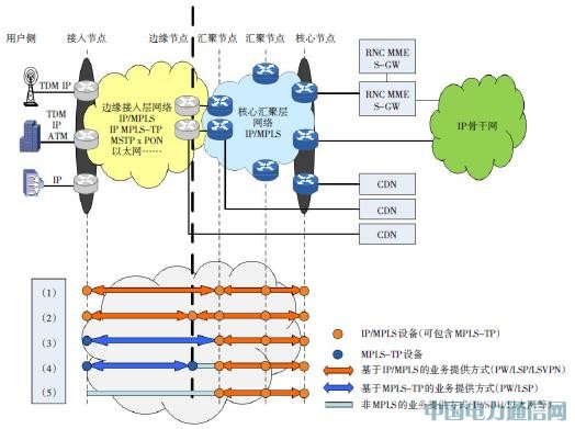 图2中的(1)至(5)描述了从边缘接入到核心汇聚网络基于MPLS功能的位置及综合业务承载网络的应用范围而提出的多种业务部署场景,这里不再赘述。